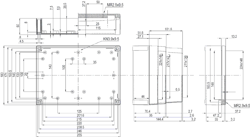 Materials Material: Polycarbonate Base color: RAL 7035 -light grey Cover color: RAL 7035 -light grey Gasket material: TPE -
